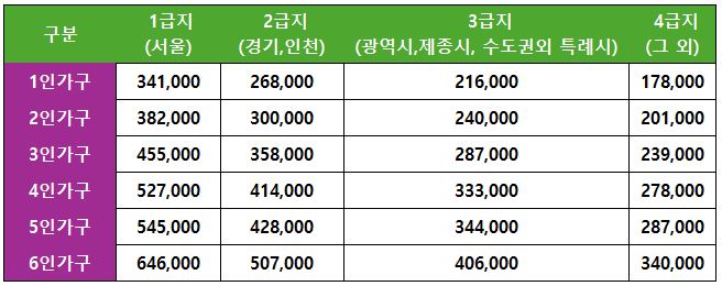 근로능력여부, 성별, 연령 등에 관계없이 국가의 보장을 필요로 하는 대상으로 소득인정액(소득평가액+재산의 소득환산액)이 기준 중위소득의 48% 이하인 가구를 대상으로 합니다. 가구단위 보장이 원칙이며, 필요한 경우 개인단위 보장이 가능합니다. ‘24년도 기준 주거급여 대상은 소득인정액 기준(기준 중위소득 48% 이하)은 다음과 같습니다.